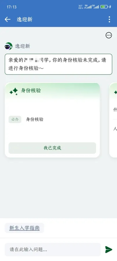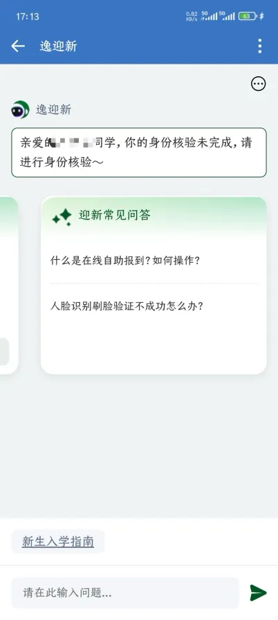 身份核验完成后,请耐心等待入学信息的生成,期间不妨先和小逸聊聊天提前了解迎新相关信息~