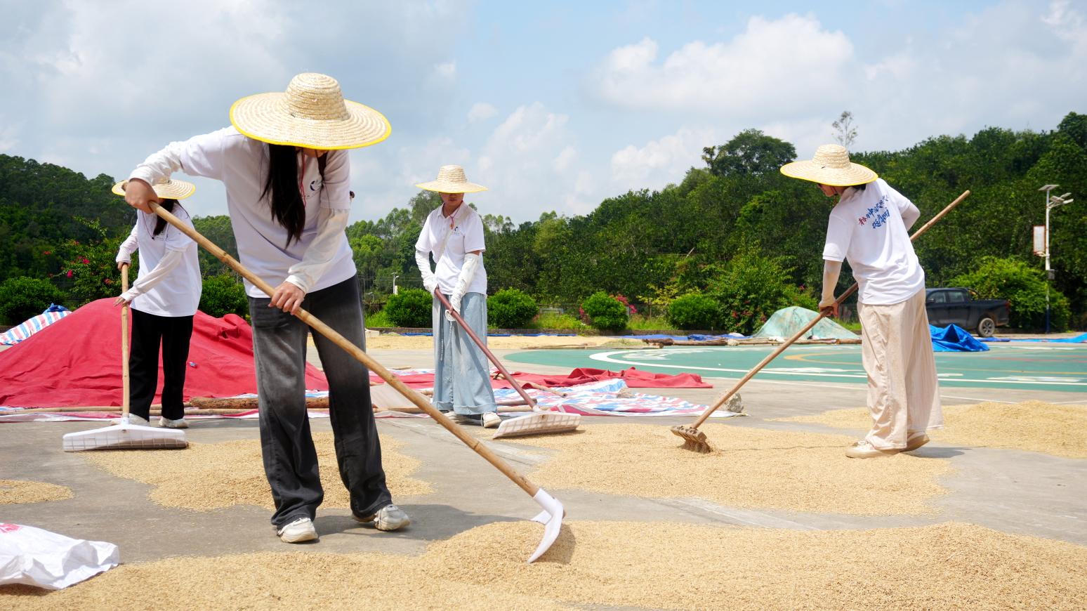 心怀感恩,方能行远。突击队在开展政策宣传之余,还积极投身当地实践,用实际行动回馈乡村的接纳与信任。他们主动参与农村人居环境整治活动,拿起工具清扫村道杂物、清理卫生死角,让村容村貌焕新颜;看到广场村民在晾晒稻谷人手不足,便纷纷上前搭把手,帮忙搬运、摊晒,汗水浸湿衣衫也毫不在意;走进罗江河沿岸开展保护活动,捡拾垃圾、宣传环保理念,守护乡村的碧水清波。这些点滴行动,不仅拉近了与村民的距离,更展现了新时代大学生的责任与担当。
