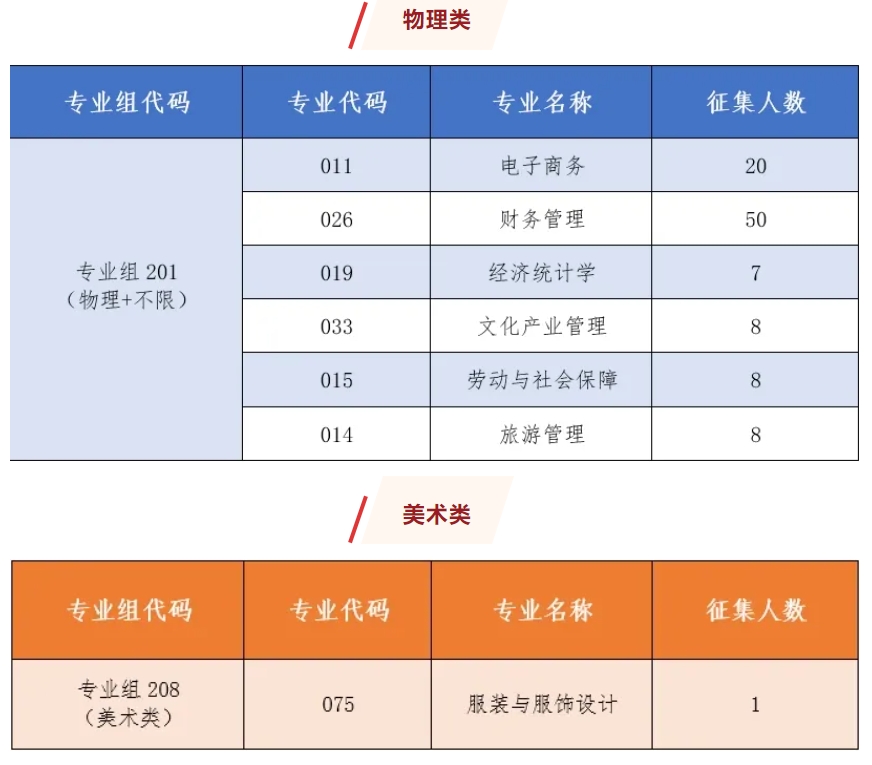 学校今年在广东省本科批次征集志愿阶段,存在少量物理类、美术类招生计划参加征集。其中,专业组201(物理+不限)有101个计划参加征集;专业组208(美术类)有1个计划参加征集,具体征集计划分布专业如下: