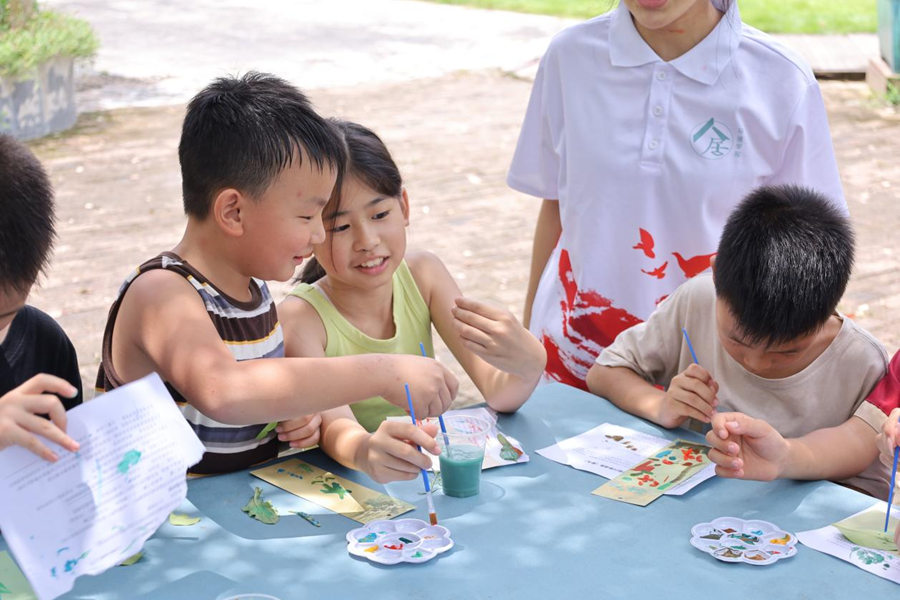惠州博罗花园村的乡野间,草木拓印与写生创作相映成趣。人居环境学院实践队带孩子们辨识花叶纹理,用锤子轻敲将自然汁液晕染成书签,让传统工艺与自然之美扎根童心;又以画笔为媒,引导孩子描摹老榕树年轮与新修步道,将家乡新貌定格成明信片,在色彩晕染中厚植乡土认同。