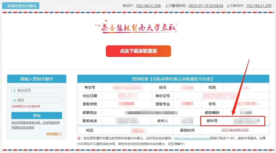 接下来,由EMS特快专递一路护送,将其安全平稳送至大家手中,请大家备好自己的身份证,静候通知书的到来。