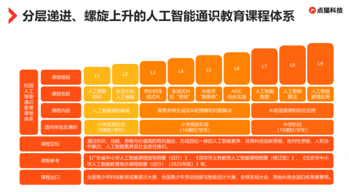 点猫科技人工智能通识教育课程依据教育部《中小学人工智能通识教育指南》相关要求设计,并重点参照了广东、深圳、北京等先行地区人工智能课程纲要。课程体系整体呈现出分层递进、螺旋上升的特点,结合不同年龄段学生的认知水平设计,旨在让学生了解和学习AI的基础知识和原理应用,通过知识、技能、思维与价值观的有机融合,促进学生人工智能素养的提升。