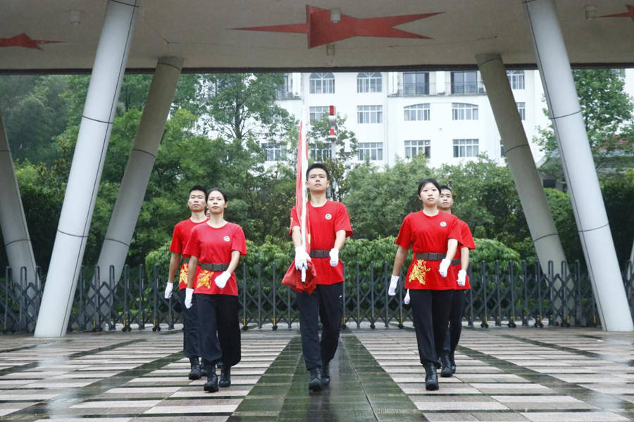 图 2 团队成员在基地风雨中坚持进行规范化升旗训练