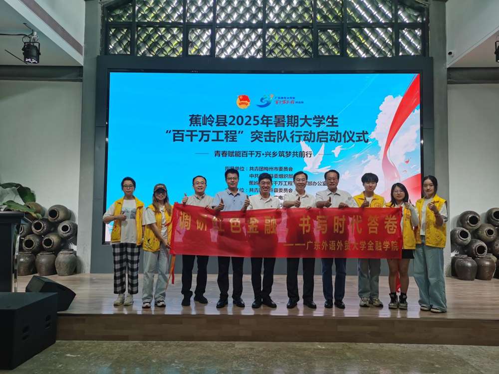 盛夏七月,一支肩负使命的年轻队伍从广东外语外贸大学金融学院出发,深入粤东革命老区——汕头、梅州、汕尾三片红色热土,开展为期15天的红色金融专题调研。7月3日,学校党委组织部正处级组织员、机关党委书记王则唐在出征仪式上为调研团授旗,标志着这支集结了专业教师、思政教师、学生党员和入党积极分子的“红色金融调研团”,在学院党委书记徐昶斌,党委副书记张璇,院党委委员、副院长张浩教授的带领下正式踏上探寻红色金融根脉的征程。
