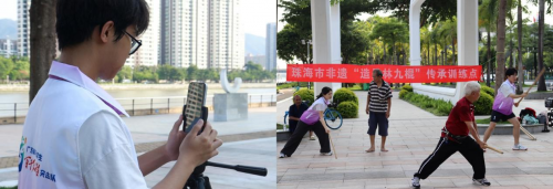 在造贝林九棍武术馆,实践团对非遗项目“造贝林九棍”展开调研与体验。七旬传承人黄华后师傅讲述了林九棍从古代“御敌之术”逐渐演变为现代“健身之道”的历史变迁。黄华后师傅数十年坚守教学一线,桃李满园的故事,让成员们深切感受到传承的热忱与担当。在黄华后师傅指导下,实践团成员们亲身习练三十六式,握棍挥打间的震颤、酸麻与汗水,让成员们真切领悟到“台上一分钟,台下十年功”的艰辛。为助力林九棍“破圈”,实践团在训练点进行直播,不仅展示出林九棍的分解动作,而且还呈现了精彩的对打套路。这场互动式直播吸引了众多网友关注,成为传播林九棍文化的一次创新尝试。