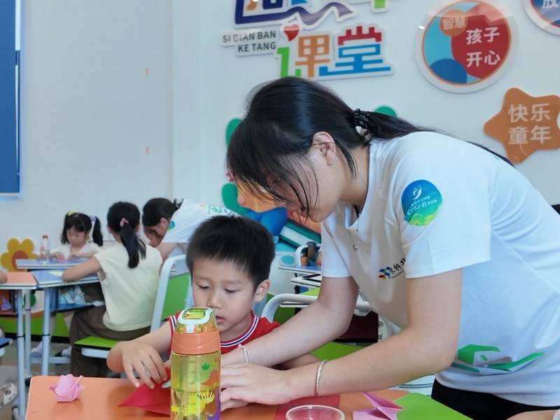 手工课上暖意融融,支教队员与小朋友们围坐成圈开展教学。队员周青霞从基础的对折、翻折等折法切入,通过清晰的示范动作逐步引导操作。孩子们眼神专注,紧紧盯着示范步骤认真模仿实践。遇到折叠不平整的地方,支教队员便俯下身手把手指导,耐心纠正细节问题。不一会儿,一只只千纸鹤、一个个纸飞机在孩子们手中诞生。