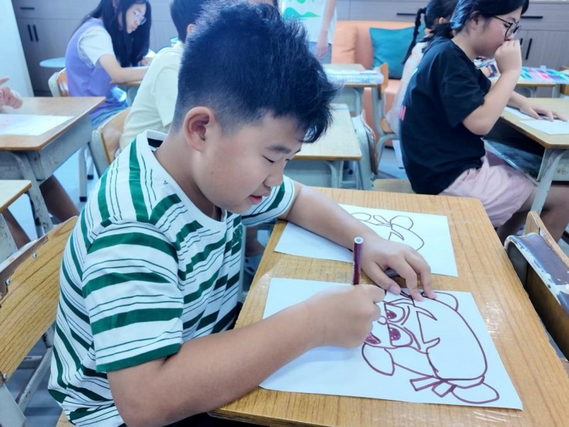 绘画课上,小朋友们化身小画家尽情创作。支教队员以孩子们喜爱的动漫角色为主题,鼓励大家展开艺术活动。孩子们手握画笔自信勾勒线条,将脑海中的奇思妙想转化为一张张色彩斑斓的画面。有的小朋友画出灵动的卡通人物,有的则在角色旁添加创意背景,每幅作品都充满童真与想象力。