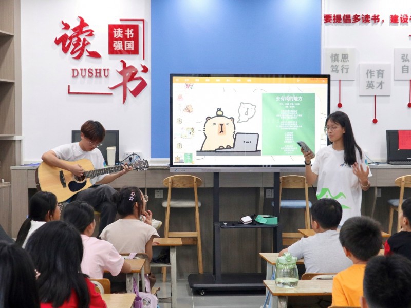 音乐课上更是活力满满,队员林志锋抱着吉他弹唱轻快旋律,屏幕中同步播放着动画形象,瞬间吸引了所有孩子的注意力。队员曾雨晴则带领大家拍手打节奏、跟唱旋律。从生疏模仿到放声合唱,孩子们的歌声在教室里回荡,笑容格外灿烂。
