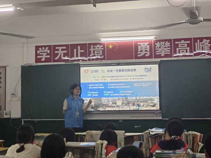 宣讲员姚雨晴为九年级学生介绍“华龙一号”的重要创新成果
