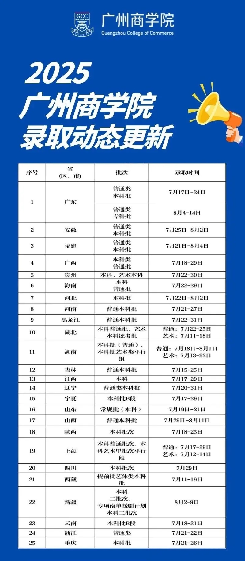 为方便广大考生查询,广州商学院根据各省(市、自治区)教育考试部门投档情况,在广州商学院招生信息网实时公布2025年普通高考招生录取进程,详情如下: