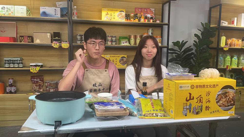 在首批广东省"“百千万工程”"典型村坡山村,师生团队化身“新农主播”,推介鹤山非遗美食与优质农产品:温三爷陈皮牛肉丸(三代手工传承)、山顶沙河粉(薄如蝉翼、米香浓郁)及通过HACCP、ISO认证的闽江鑫渔黑鱼片。直播中,学子们结合乡村故事与品鉴体验,让农产品成为文化传播的载体。