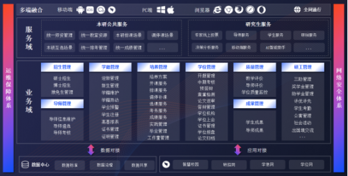 围绕管理、服务、质量、决策支持四个方面,构建完整的研究生全链应用体系,覆盖招生入学、在校培养、研工管理、论文管理、学位授予、成果管理、档案管理、离校管理、就业管理等全域业务,为业务部门提供便捷地管理服务,为用户提供PC端和移动端的一站式综合服务门户,为管理员提供管理整个平台的应用和数据的管理服务,为领导提供决策支持依据,稳步提升研究生教学管理与服务水平。