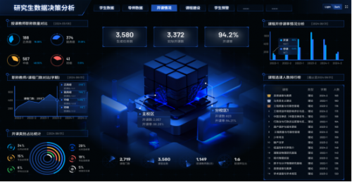 · 多维度数据分析:教室资源利用情况、教室类型分布、师资结构、本研师生比、本研授课课堂数及占比、本研教师授课门数及占比等,实现资源优化配置与质量评估。
