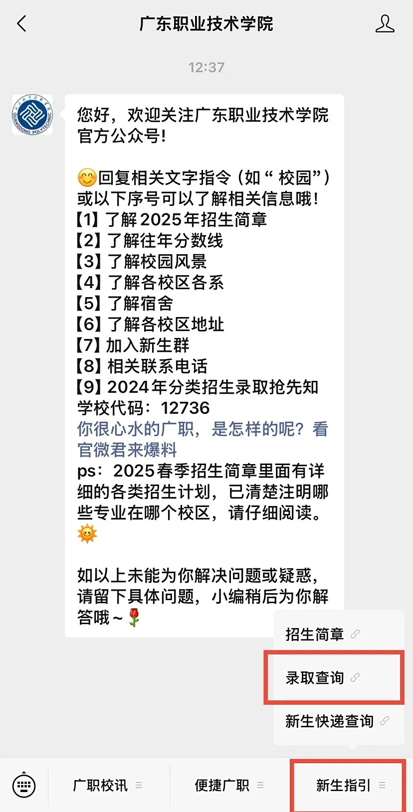 关注“广东职业技术学院”微信公众号,点击菜单栏“新生指引”——“录取查询”即可查询。
