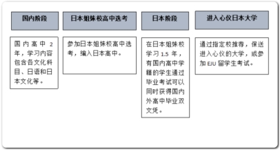(1)独创2+1.5留学体系:国内高中2年,学习内容包含各文化科目、日语和日本文化等;参加日本姐妹校高中选考,编入日本高中;在日本姐妹校学习1.5年,有国内高中学籍的学生通过毕业考试可以同时获得国内外高中毕业双文凭;通过指定校推荐,保送进入心仪的大学,或参加EJU留学生考试。