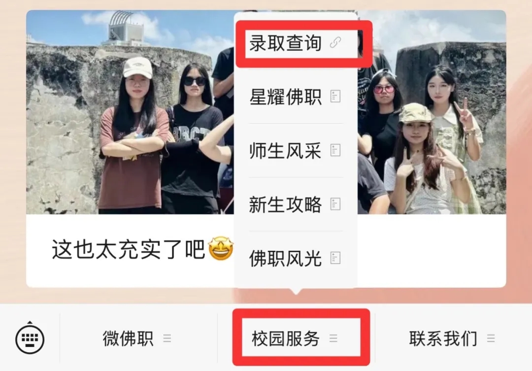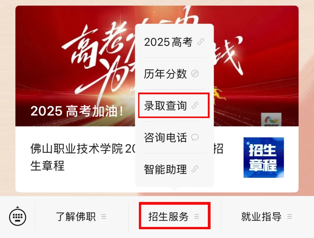 扫描下方二维码,关注“佛山职业技术学院”公众号,点击“校园服务—录取查询”,输入考生姓名和身份证号即可查询。
