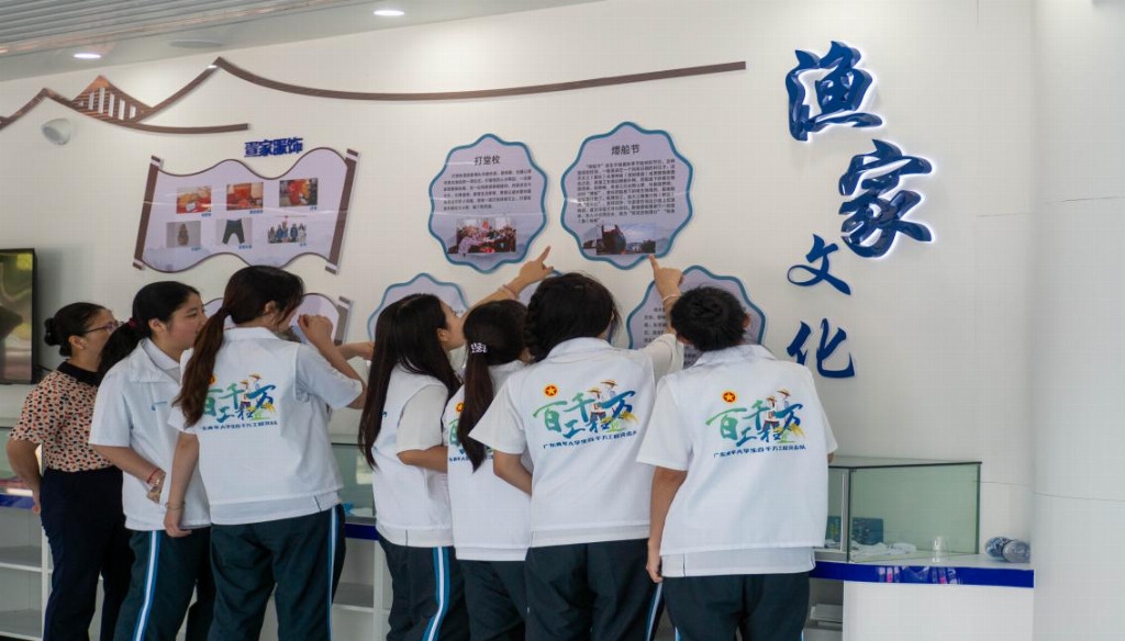 突击队深入国家级4A景区大澳渔村,在大澳渔村党支部书记、渔委会主任杨怀键,大澳党支部委员、渔委会副主任杨丹丽及东平镇团委副书记冯瑶瑶的支持对接下,突击队深入古村落调研,考察非遗展厅的渔民画、咸水歌及民俗博物馆的渔船模型、传统渔具等,探寻渔村历史脉络。