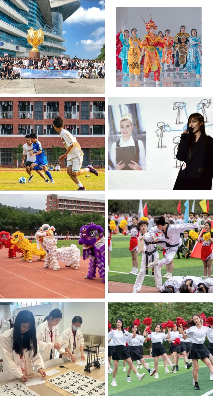 学校课余生活丰富多元,香港研学拓宽视野,社团活动精彩纷呈,校园赛事创意不断,趣味运动会与田径运动会活力四射,青春在这里尽情绽放。