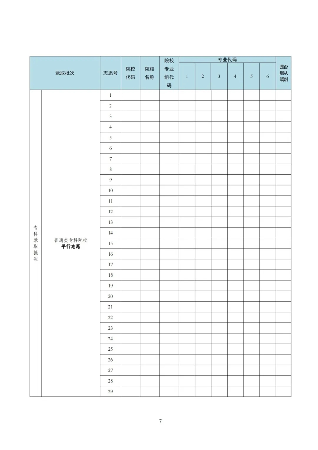 1.专科批次普通类(历史、物理)可填报45个院校专业组志愿,每个院校可填报6个专业志愿及1个是否服从调剂选项;体育类、艺术类可填报20个院校专业组志愿,每个院校可填报6个专业志愿及1个是否服从调剂选项。