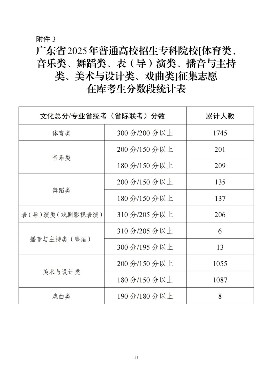 3.广东省2025年普通高校招生专科院校[体育类、音乐类、舞蹈类、表(导)演类、播音与主持类、美术与设计类、戏曲类]征集志愿在库考生分数段统计表