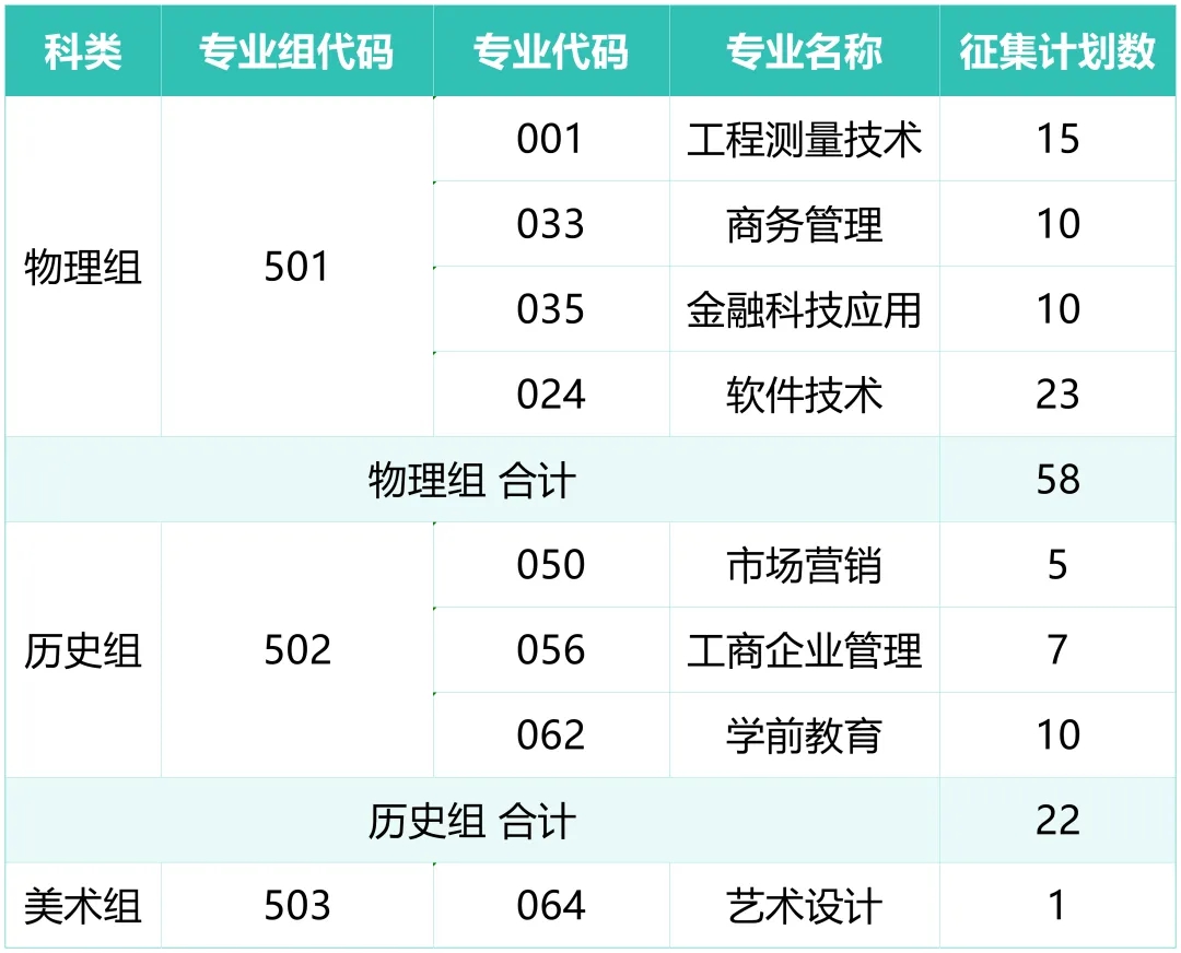 专科批次体育类、艺术类征集志愿录取与普通类(历史、物理)征集志愿录取同步进行。正式投档前,将视院校生源情况,对各科类、各院校专业组间计划进行适当调整。投档录取办法如下: