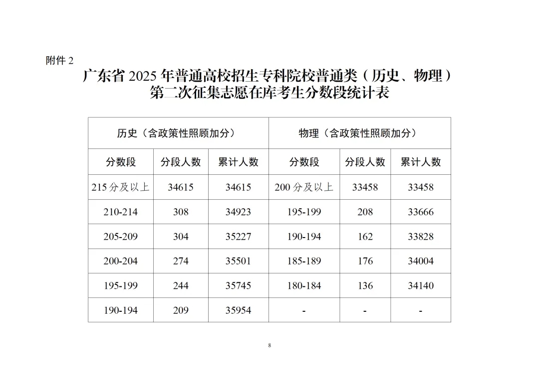 2.广东省2025年普通高校招生专科院校普通类(历史、物理)第二次征集志愿在库考生分数段统计表