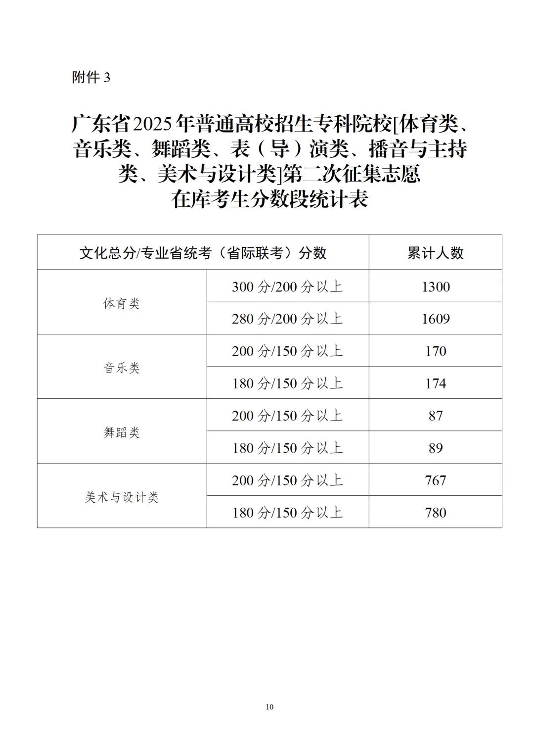 3.广东省2025年普通高校招生专科院校[体育类、音乐类、舞蹈类、美术与设计类]第二次征集志愿在库考生分数段统计表