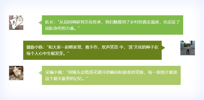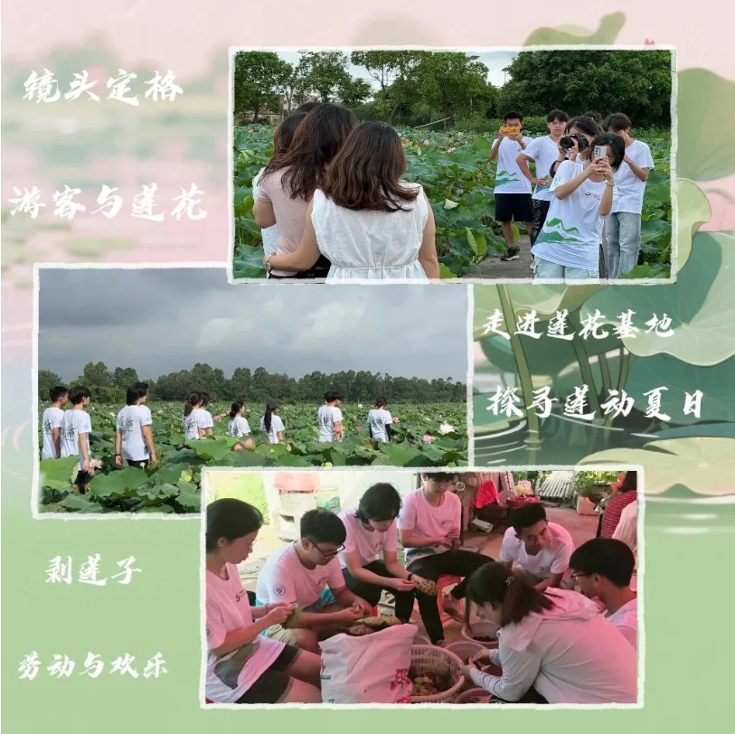 实践团成员走进莲花种植基地,了解“一莲九宝”的种植奥秘:从藕田到莲蓬,每一株莲都藏着致富密码。团队成员围坐在一起剥莲子,感受劳作的欢乐。漫步莲塘边,我们用镜头定格莲花盛开的美丽瞬间和游客与莲花的欢乐合照。