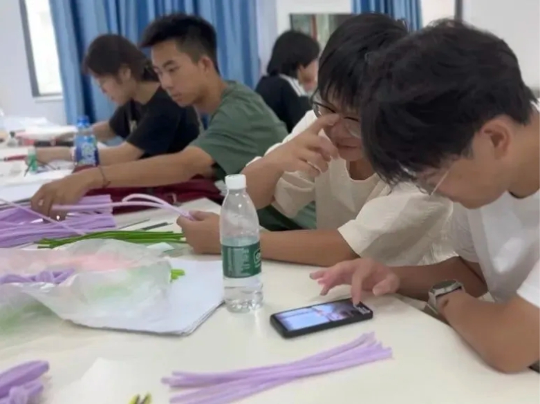 扭棒在手间绽放,蜡笔画定格莲韵之美。团队成员不仅学习制作莲花扭扭棒和蜡笔画,还拍摄科普视频,解锁莲“全身是宝”的奥秘——藕可食、叶可茶、花可赏……队员化身“莲讲师”,为游客科普莲花知识,手把手教小朋友制作莲主题手作,笑声与莲香交织,文化在指尖生根发芽。