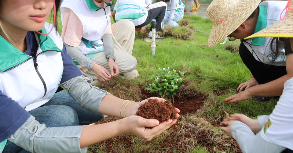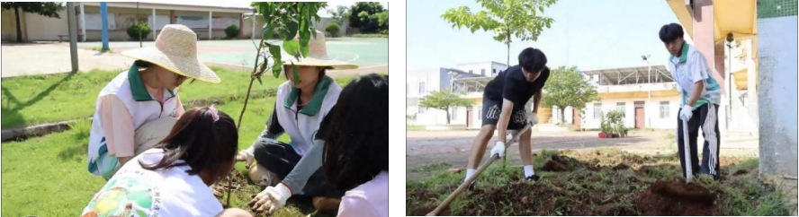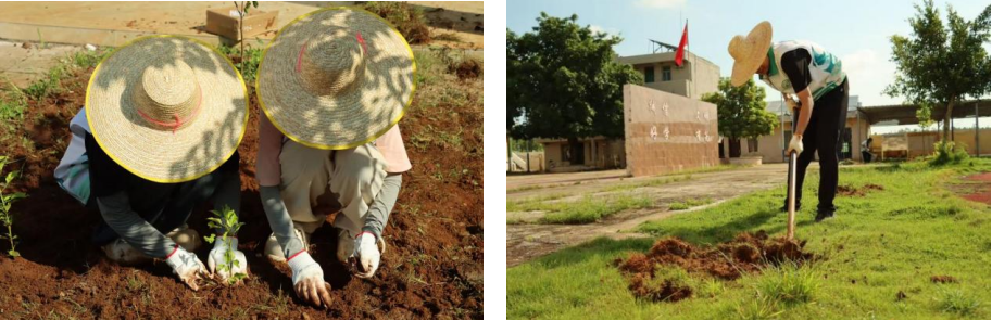 在每一个露珠还未散去的清晨,"香伴同行"突击队的队员们已忙碌在村委会的苗圃间。清点树苗、挥瓢浇水,一株株承载着绿色希望的树苗被小心运送至大群小学。除草、翻土、栽种……队员们将荒芜的角落变为生机盎然的"绿野乐园",栀子花的清香与洒金榕的斑斓交织,为校园绘就一幅乡村振兴的生态画卷。