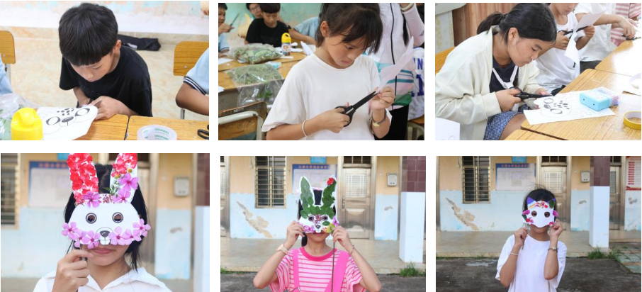 在“自然面具”创作环节,突击队员分组带领儿童采集本土植物素材,手把手指导裁剪、拼贴等创意手法,将自然元素与儿童想象力结合,创作22件充满童趣与乡土特色的作品,孩子们专注沉浸其中,既锻炼儿童动手能力,又让其在实践中感受本土自然文化之美,助力乡村文化创意培育与自然文化资源保育。