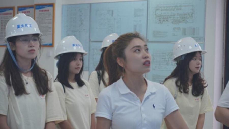 图为小队成员观摩湖北星火化工有限公司工厂,了解科技领域。黄钰涵供图