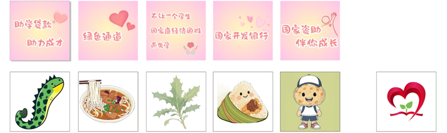 团队立足侨乡文化基因与地方特色资源,构建 “三维一体”政策传播体系:以恩平烧饼、大刺鳅、簕菜、濑粉等特色农产品为灵感,创新设计 “点滴积累”零钱包、“政策钥匙”挂饰、“资助对对碰”游戏卡片等文创产品,让政策宣传可触可感;创作故事绘本 《烧饼里的光》,通过侨乡学子受助成长的温情叙事传递制度关怀;融合大钟楼、熙春塔、恩平博物馆等城市地标与资助政策标语,设计“地标+政策”系列海报实现视觉强渗透;摄制粤语广播小剧场,以乡音乡情打通政策传播“最后一公里”,形成 “产品承载乡情、故事传递温度、视觉深化记忆、乡音触动心灵” 的全链条传播生态。