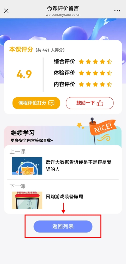 4.微课学习完成后会有“恭喜,你已完成本了微课的学习”的提示,此时需点击【返回列表】,这样才能记录微课完成的状态,已完成的微课可以重复学习。