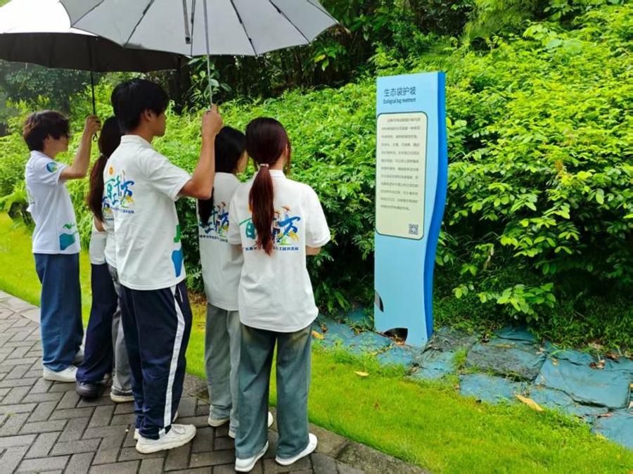 深圳市水土保持科技示范园,作为国内首个水土保持科技示范园,是将废弃采石场成功蝶变为集生态修复、科普教育、科技示范于一体的国家级标杆,生动诠释了“绿水青山就是金山银山”的发展理念。在园区讲解员的引导下,实践团开启了一场沉浸式生态研学之旅。从形似蚯蚓洞穴、诠释生物与水土共生关系的网红地标“蚯之丘”,到通过4D影片让成员身临其境感受水土流失震撼冲击的微型影院,再到直观揭示坡度、植被与水土流失内在关联的模拟示范区,园区将“植被护土、生态保水”的科学逻辑具象化呈现,让在场师生对水土保持的迫切性与重要性有了更为深刻的领悟。