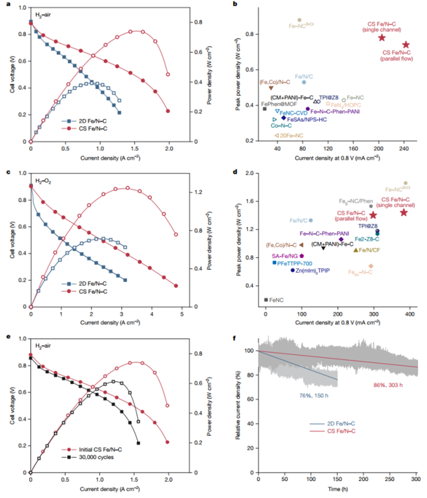 实验结果表明,该催化剂在PEMFC中实现了0.75 W cm⁻²(H₂–air, 1 bar)峰值功率密度,并在300小时连续运行后保持86%活性,实现了非贵金属体系PEMFC前所未有的最优综合性能。