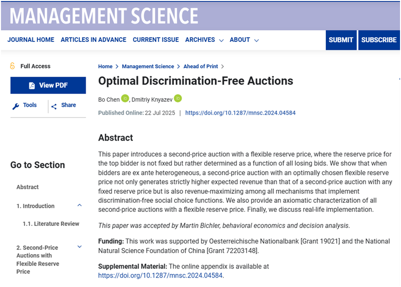 近日,经济学院副教授陈博与合作者奥地利维也纳大学助理教授Dmitriy Knyazev的合作论文“Optimal Discrimination-Free Auctions”在管理学国际顶级期刊Management Science在线发表,深圳大学为第一署名单位。这是深圳大学经济学院建院以来发表的首篇MS期刊论文,标志着深圳大学应用经济学科建设取得重大突破。