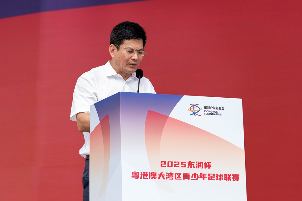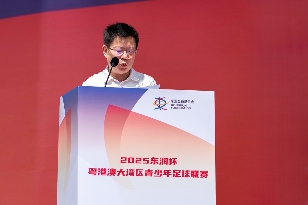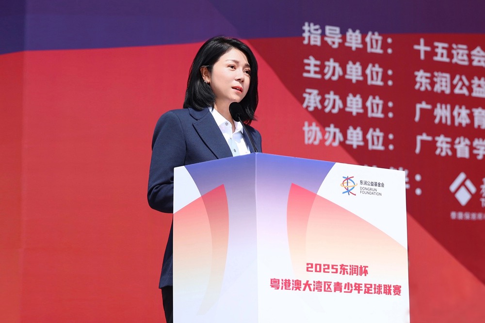 东润公益基金会理事长孔东梅女士深情致辞,阐述了举办本次联赛的初衷与愿景。她表示:“足球的复兴寄托着整个民族的梦想,而中国足球的未来,在青少年。东润公益基金会自2023年启动青少年足球支持项目以来,项目迅速席卷全国20余省,通过装备捐赠、支教帮扶、赛事搭建等方式,已累计支持了380余支优秀的中小学校园足球队,助力6000余名顶尖青少年球员逐梦绿茵。今天,看到粤港澳三地青少年因足球相聚于此,我深感振奋。希望你们以奋勇拼搏的姿态诠释体育精神,在赛场上收获快乐与荣誉,更在足球世界里学会坚持、团结与责任,为中国足球的未来注入新生力量!”