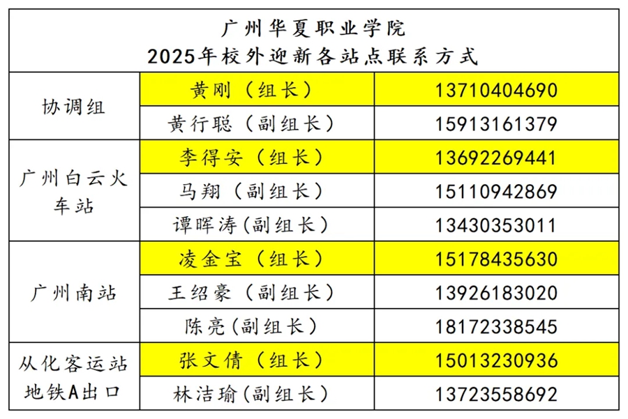 9月6-7日8点-17点,我校分别在广州南站、广州白云火车站、从化客运站地铁站A出口设有新生接待站,新生及家长可免费乘坐学校专线大巴抵达我校。如果新生提前到达,请务必耐心等待我校接待人员,并注意看管好自己的行李物品,小心保管,谨防被盗或丢失,切勿轻信他人。