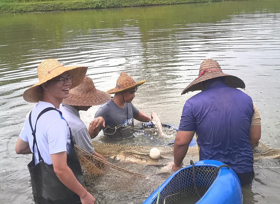 “一二三,起!” 陈金均与渔场工人齐声喊出的号子,冲破了风雨的阻隔。他们小心翼翼地将亲鱼装入网箱,每一个动作都紧绷着神经:既要避免亲鱼受伤,又要加快作业节奏。雨珠顺着脸颊滑落,泥水浸透了衣裤,可没有一个人停下手中的活。这场与时间的 “抢捞战”,不仅让队员们亲身体验了渔业生产的艰辛,更让他们深刻读懂了劳动人民顺应自然、善用规律的智慧,也愈发坚定了他们用专业技术助力现代渔业发展的决心。