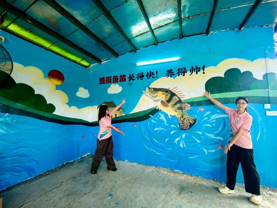 “盛鳜鱼苗,长得壮,养得靓!” 如今走进盛鳜渔业场区,这句朗朗上口的标语总会先映入眼帘,旁边的墙绘更是生动 —— 灵动的鳜鱼跃出水面,溅起的水花里藏着成群的小鱼苗,仿佛在追逐着丰收的希望,让原本朴素的渔场多了几分生机与活力。这面墙绘,正是实践队为渔场量身设计的 “活招牌”。