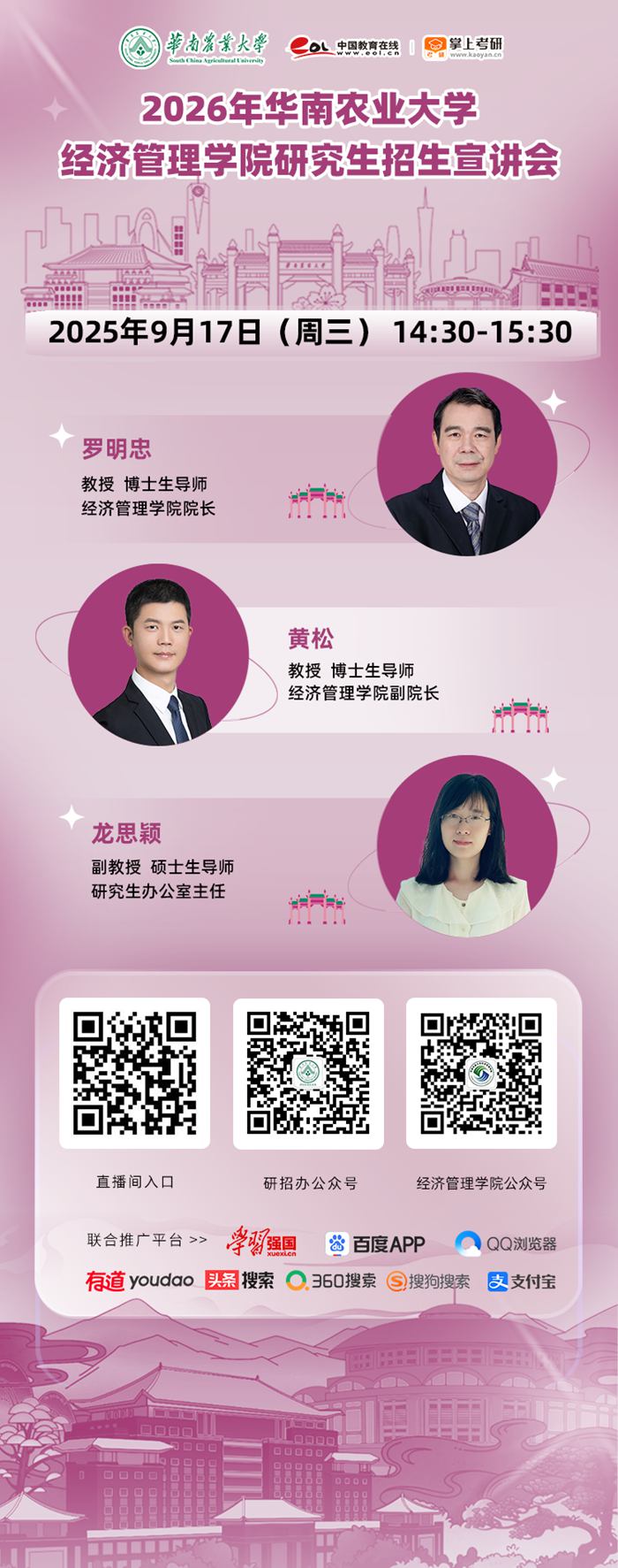 9月17日(周三)下午14:30,华南农业大学经济管理学院2026年研究生招生线上宣讲会即将开启!