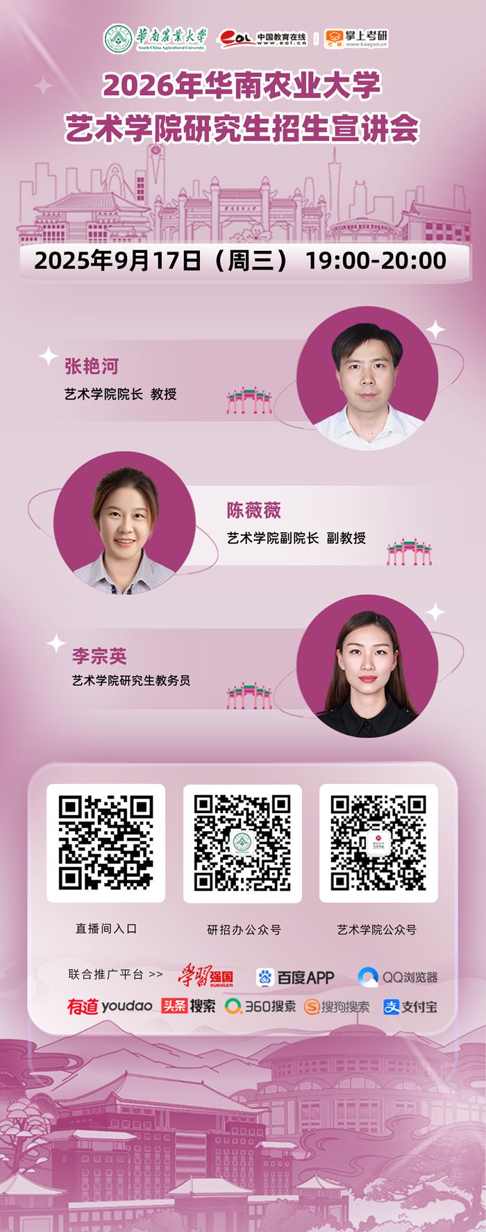 9月17日(周三)晚上19:00,华南农业大学艺术学院2026年研究生招生线上宣讲会即刻开讲!
