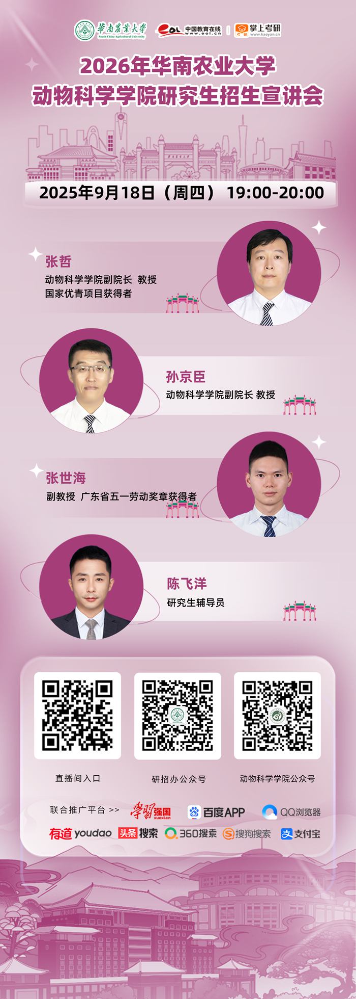 9月18日(周四)晚上19:00,华南农业大学动物科学学院2026年研究生招生线上宣讲会即将开讲!