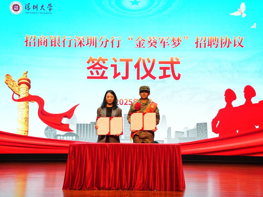 首批签约仪式上,电子与信息工程学院张家俊同学与招商银行深圳分行现场签署“金葵军梦”招聘协议。该举措创新实施“先就业、再入伍”模式,为学生保留就业岗位,解除后顾之忧,彰显了校企协同支持国防建设的现实意义。