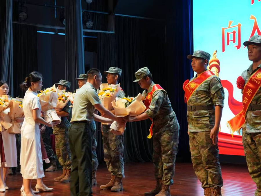 南山区人武部及相关学院(部)领导为新兵送上鲜花与纪念品,表达殷切期望。