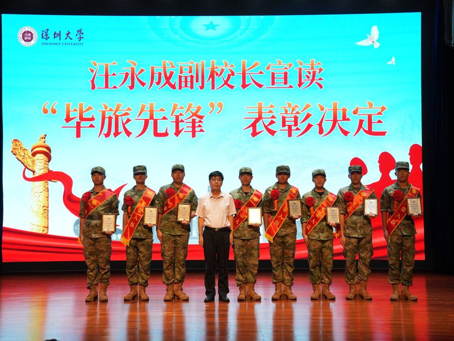 今年学校首次为应届毕业入伍学生设立“毕旅先锋”荣誉称号,共有17名同学获得表彰,副校长汪永成宣读表彰决定并为获奖学生颁授荣誉奖牌。这一举措进一步丰富了深圳大学国防育人的内涵,体现了对学生多元发展的支持。汪永成还在讲话中勉励同学们坚定报国信念,发挥专业特长,在部队淬炼成才,并表示母校永远是同学们的坚强后盾,期待大家早传捷报。