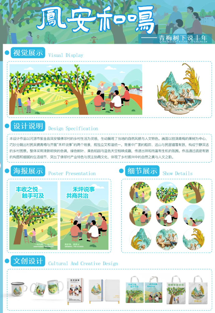 团队深入挖掘佛岭文化元素,将“禾坪说事”、青梅、稻穗等符号融入文创产品设计,开发出包括主题马克杯、冰箱贴、笔记本、帆布包等一批兼具实用性与文化内涵的文创作品。暖黄色的杯身绘有田园议事场景,冰箱贴展现丰收喜悦,笔记本记录共治点滴,帆布包则融合青梅与议事图案,生动传递佛岭村的产业特色与治理文化。