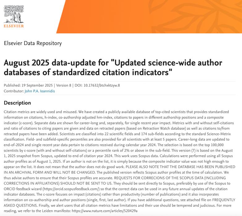 斯坦福大学“全球前2%科学家榜单”是美国斯坦福大学John P. A. Ioannidis教授团队和Elsevier合作的一个名为“更新的标准化引文指标科学家作者数据库”项目的数据成果,发布在Elsevier旗下的Mendeley Data网站上。榜单基于Elsevier Scopus的数据,使用了六种关键指标综合评估来进行打分。该榜单的“终身科学影响力排行榜”和“2024 年度科学影响力排行榜”,分别对应1960-2024,2024-2024两个时间区间的综合数据。两个排行榜单内均包括含自我引用和不含自我引用数据的排名信息,以及每位科学家在其子学科内的综合引用指数排名。