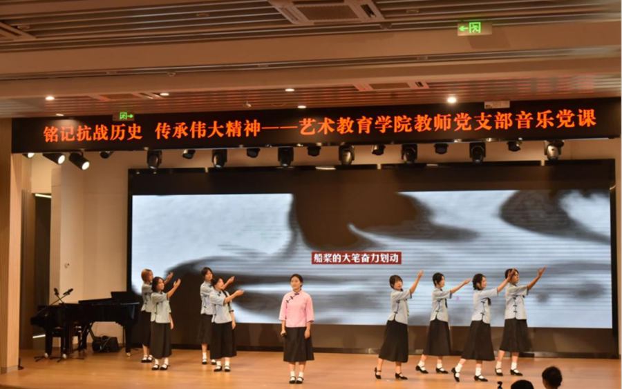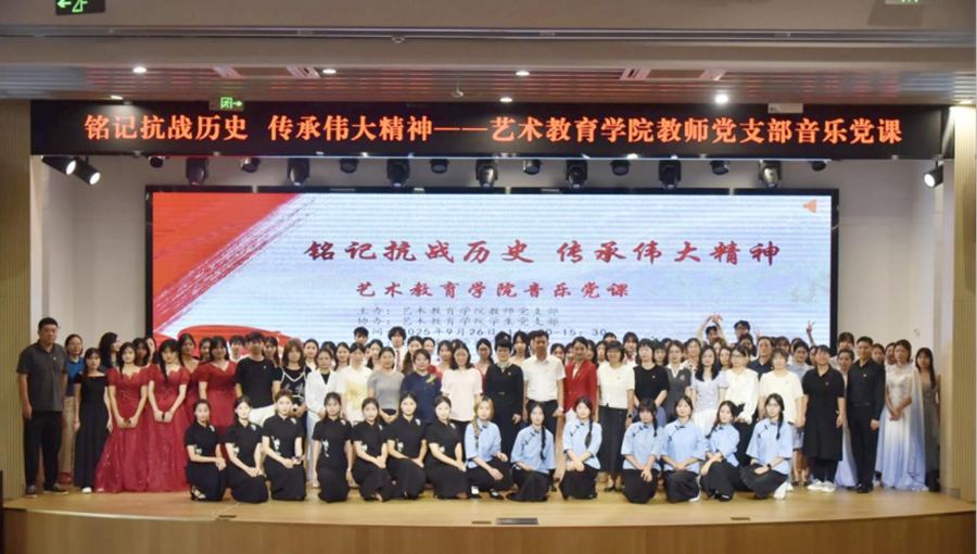 以艺术为纽带,连接历史与现今;以精神为灯塔,照亮复兴之路。此次音乐党课不仅让广大党员师生接受了一次深刻的思想洗礼,更凝聚起“铭记历史、开创未来”的共识。艺术教育学院教师党支部将以此次活动为契机,持续探索党建与艺术教育融合的新路径,让抗战精神在立德树人的实践中绽放更加璀璨的光芒,为实现中华民族伟大复兴的中国梦贡献教育力量。